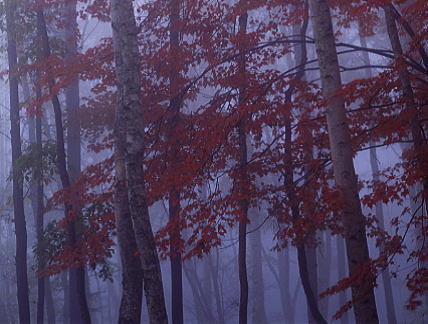 紅葉の白樺林を狙って、大峰高原にでかけたが、霧の深い日だった。