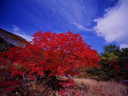 見事に色づいた一株のナナカマドが、まさに秋晴れとなった深く澄んだ