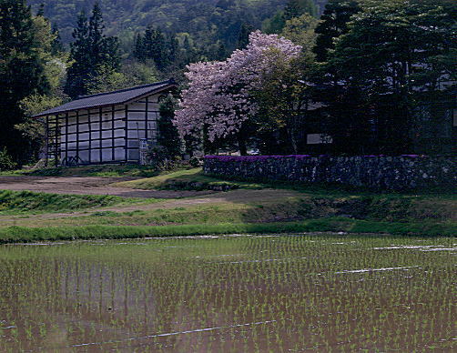 蔵 の あ る 春 (大町市鹿島部落) 田植えの季節もおわり、農家の忙しさも一段落。大山桜がやさしく咲き誇る姿に気が安まる。 そんなのどかな安曇野の春のワンシーンだ。 ひとつ前のページに戻る
