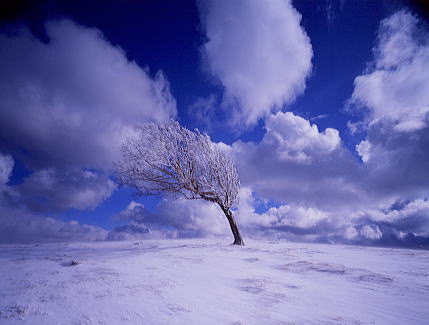寒さの厳しい高冷地。高原にそびえる一本の木が強い季節風にあおられてる。木が揺れるたびに葉についた霧氷が輝いて見えた。