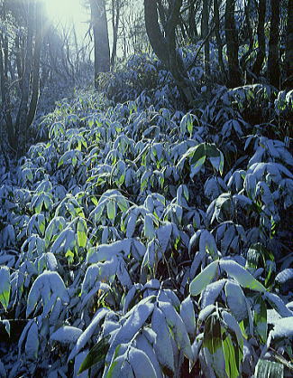 日中の気温も零度以下の真冬日、うっすらと雪化粧した笹に