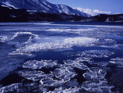 春を迎えつつある湖。厚かった氷が気温の上昇とともに薄くなり、