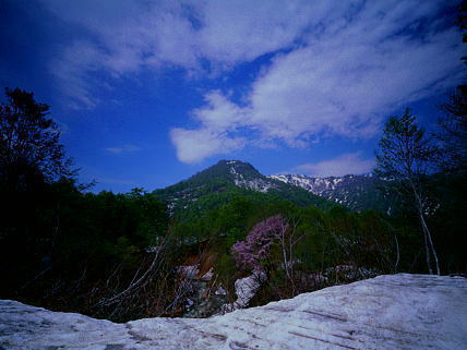 晴れ渡った空に残雪が映える。新緑の木々、オオヤマザクラ、高冷地