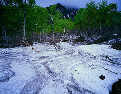 小雨が降り、残雪の表面が解けておもしろいしま模様を作り出していた。